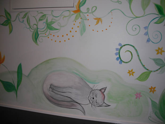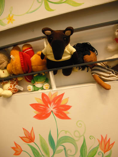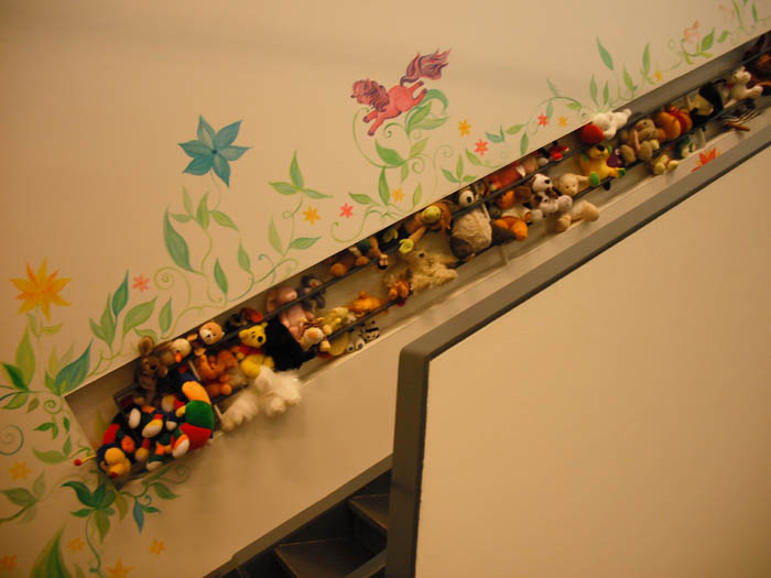 The stairs with Mari's paintings and all kind of soft animals